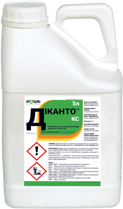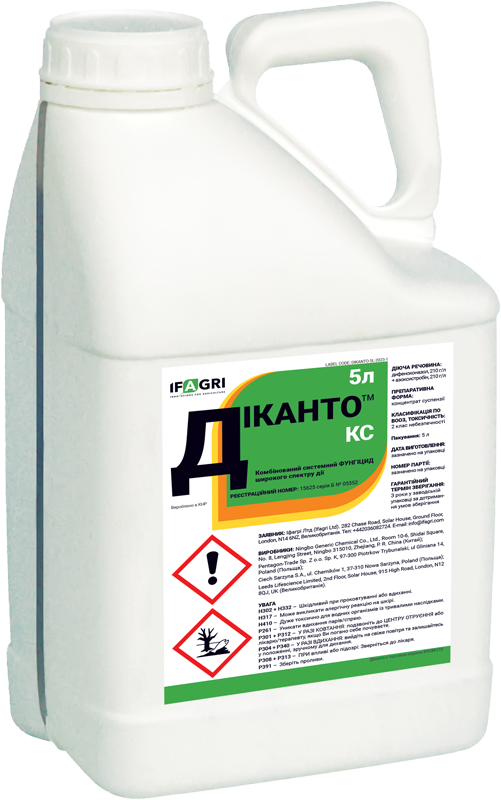 Діканто, КС – cистемний двокомпонентний фунгiцид широкого спектру дiї з діючими речовинами з хімічних груп триазолів і стобілуринів. Препарат застосовується протягом вегетації соняшнику, ріпаку, пшениці та сої для захисту від альтернаріозу, сірої гнилі, білої гнилі (слекротиніозу), ризоктоніозу та інших хвороб грибного походження.