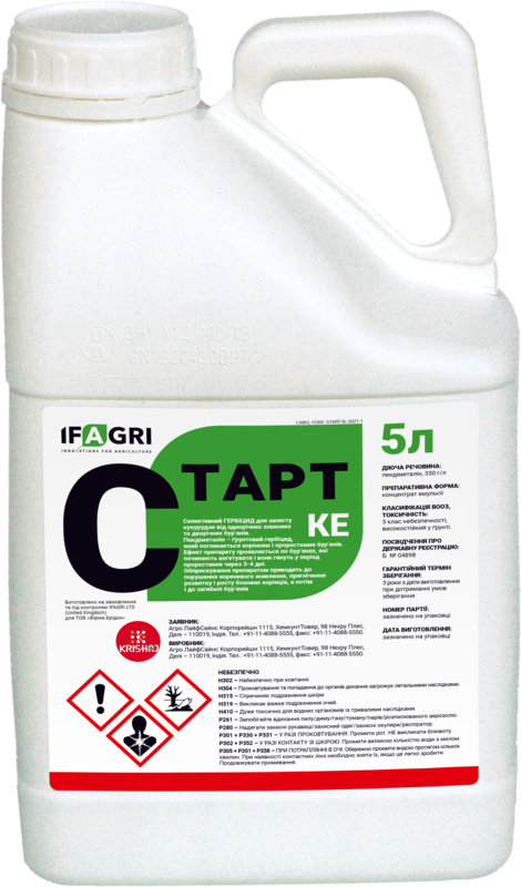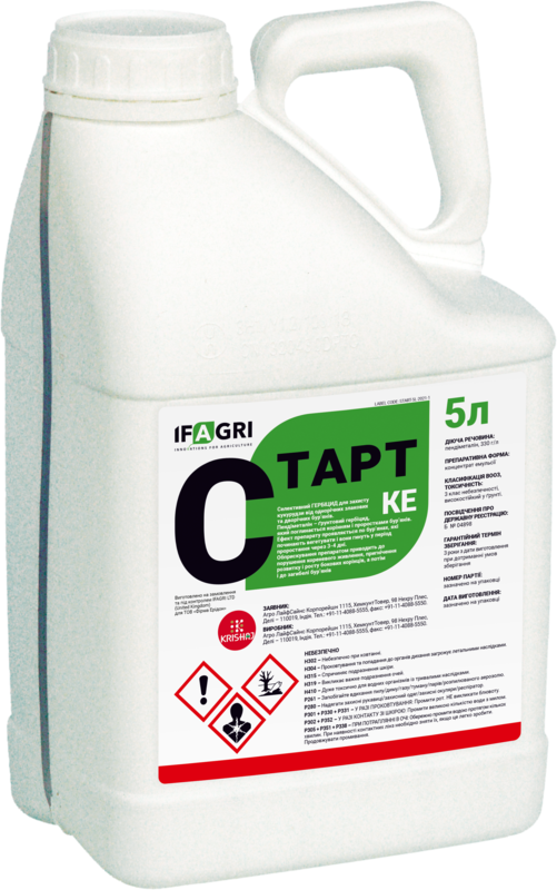 Гербіцид у вигляді концентрату емульсії. Діюча речовина препарату Старт, КЕ – пендиметалін, 330 г/л належить до хімічного класу динітроанілінів. Пендиміталін інгібує кореневу меристему, порушує пізні стадії мітозу, блокує утворення білку. Старт, КЕ активний до насіння, яке проростає, тому застосовується тільки для ґрунтового внесення. Препарат не потребує заробки в ґрунт в умовах достатнього зволоження. Проте за відсутності опадів впродовж тривалого часу до сівби культури, заробка в ґрунт підвищує його ефективність, після чого будь-які механічні обробки ґрунту не допускаються.